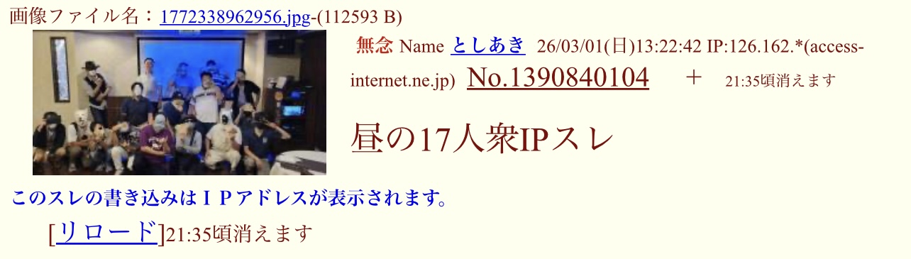 | … | 94無念Nameとしあき26/03/01(日)14:01:56No.1390849019+>最近17人衆をV粘着活動にボランティアとして参加させたがってる荒らしが目に付くけど |