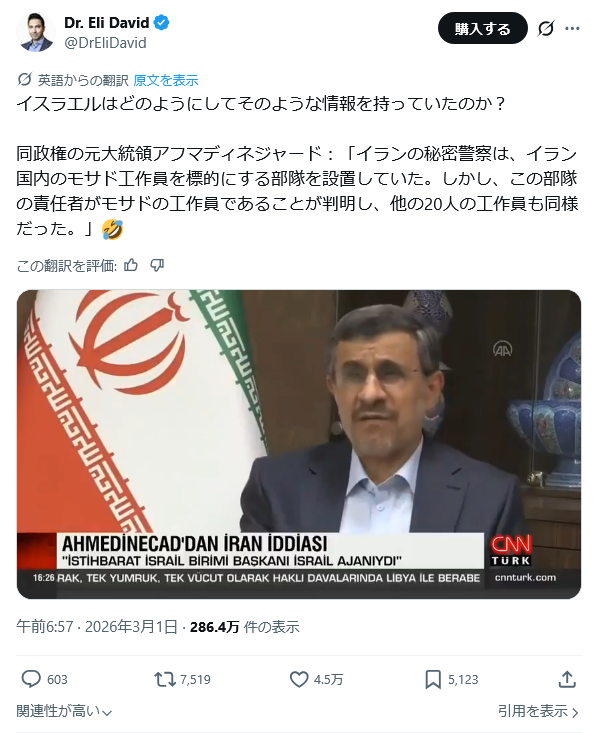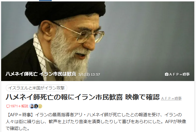 | … | 63無念Nameとしあき26/03/01(日)17:00:51No.1390887954+>てか日本のマスメディアのイラン贔屓なんなの… |