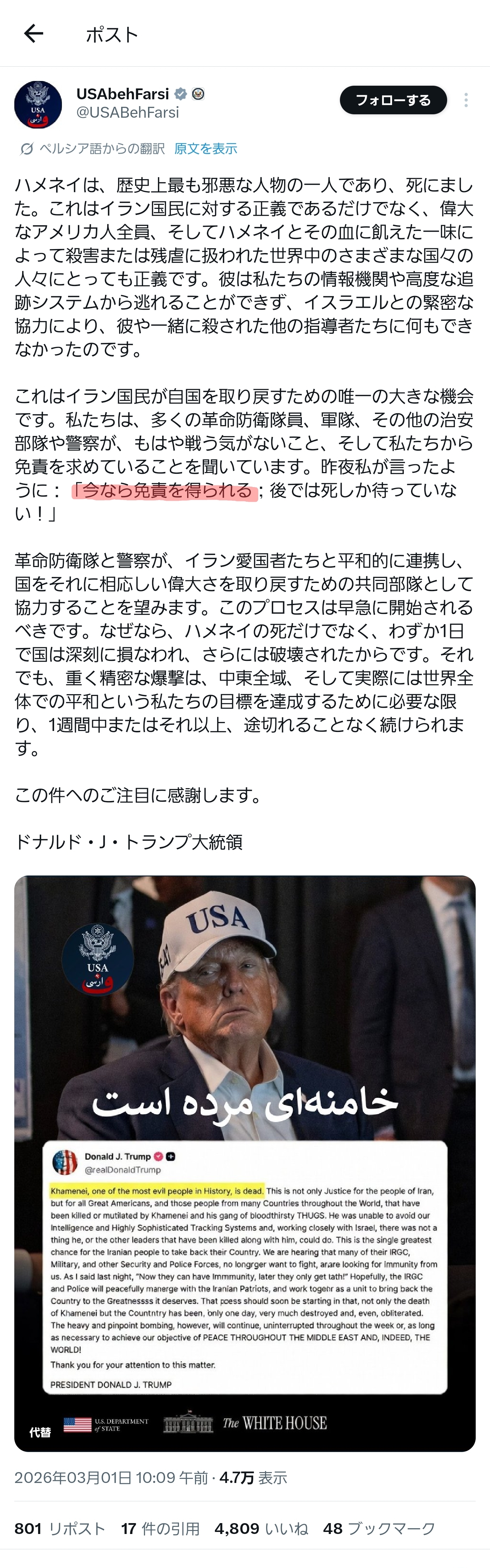| … | 210無念Nameとしあき26/03/01(日)17:47:55No.1390899221+>>圧倒的かつ決定的な報復を行う旨宣言 |
