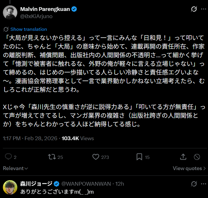 | … | 21無念Nameとしあき26/03/02(月)13:25:38No.1391084553+>漫画家は漫画だけ描いてろよ... |