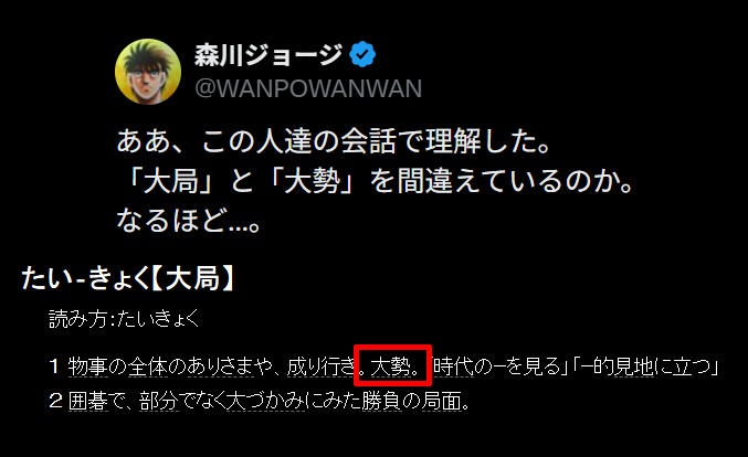 | … | 40無念Nameとしあき26/03/02(月)13:35:56No.1391086157+>>森川ジョージ「大局と大勢を間違えているのか。なるほど…」 |