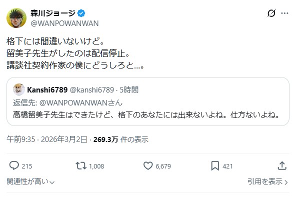 | … | 74無念Nameとしあき26/03/02(月)13:59:32No.1391089576+実人生の大御所の立場をSNSでも発揮できると勘違いした漫画家 |