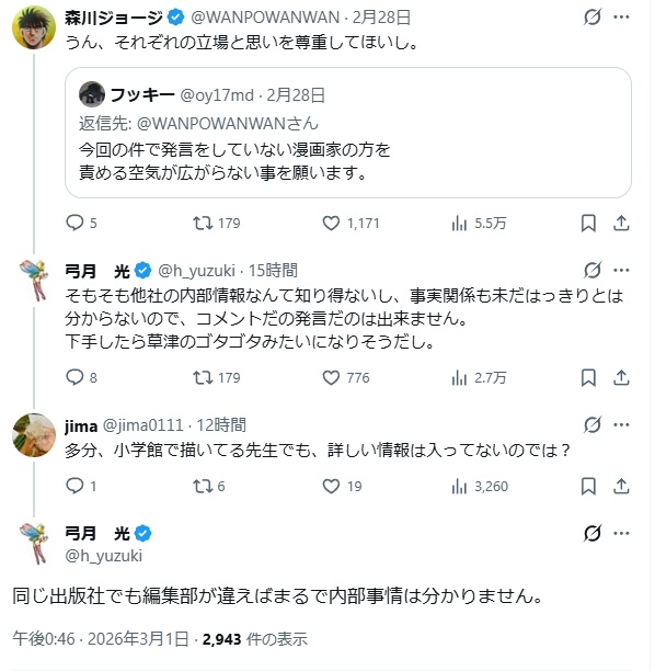 | … | 325無念Nameとしあき26/03/02(月)15:16:36No.1391100617+>漫画家のSNSなんて日々の出来事をたまに呟くぐらいでいいんよな |