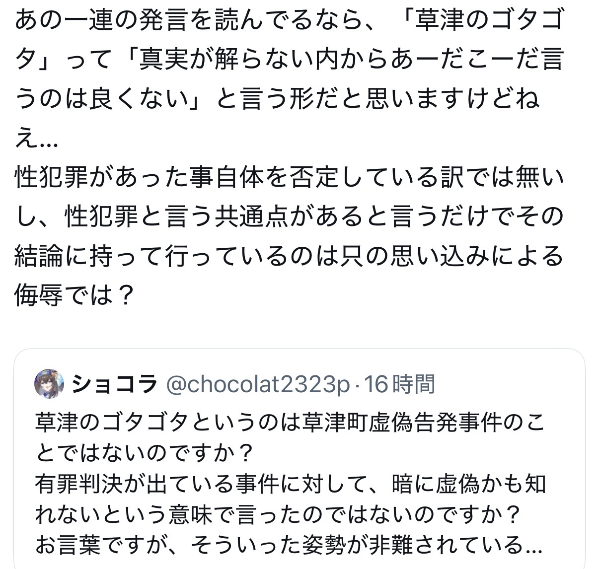 | … | 312無念Nameとしあき26/03/02(月)15:13:17No.1391100130そうだねx2なんで冤罪の可能性一切無いのに草津の件を引き合いに出してるの? |