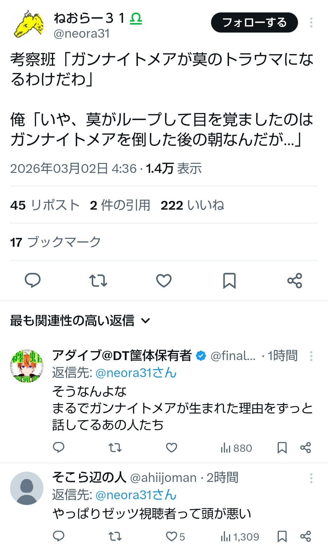 | … | 778無念Nameとしあき26/03/02(月)22:08:31No.1391198763+ここで口汚くゼッツを叩いて朝から晩までゴミクズ同士馴れ合ってれば |