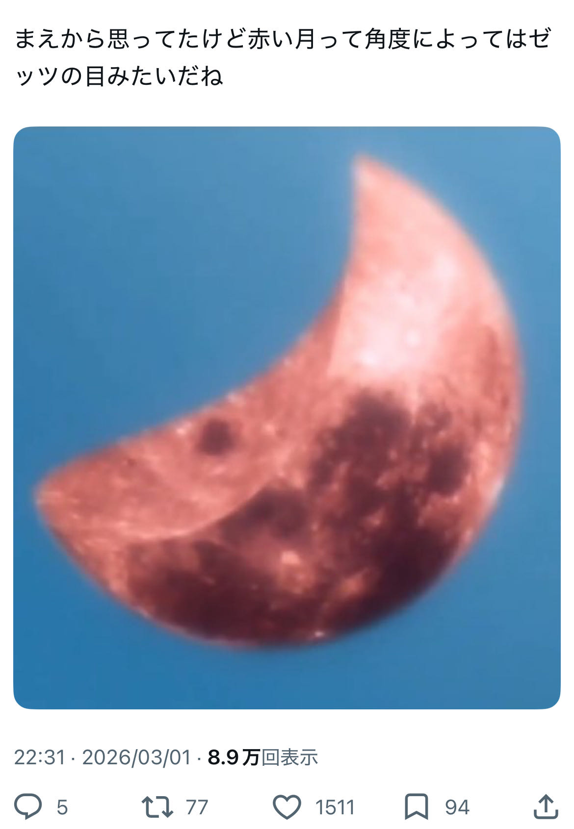 | … | 755無念Nameとしあき26/03/02(月)22:05:01No.1391197776+>布団に入って寝ようとしてるのにもう赤い月がある |