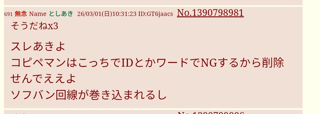 | … | 723無念Nameとしあき26/03/02(月)22:00:04No.1391196418+いくらコピペ!コピペ!喚いたところで |
