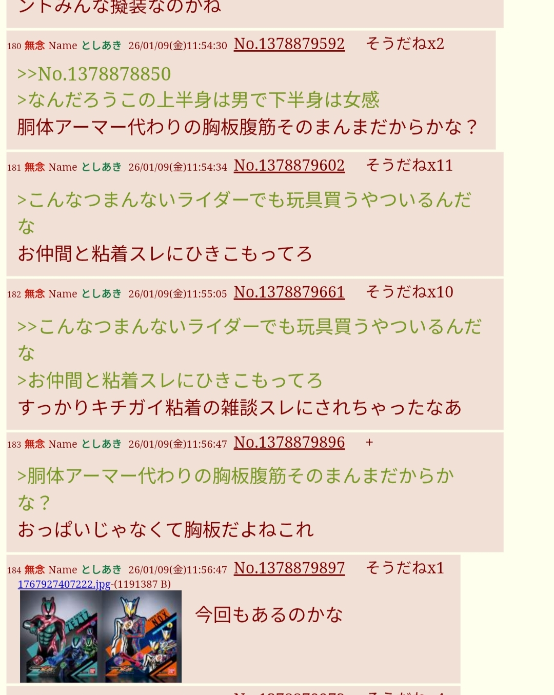 | … | 776無念Nameとしあき26/03/02(月)22:08:09No.1391198655+ニチアサでワイワイ盛り上がってるにエモバズとか寒いあだ名付けるような |