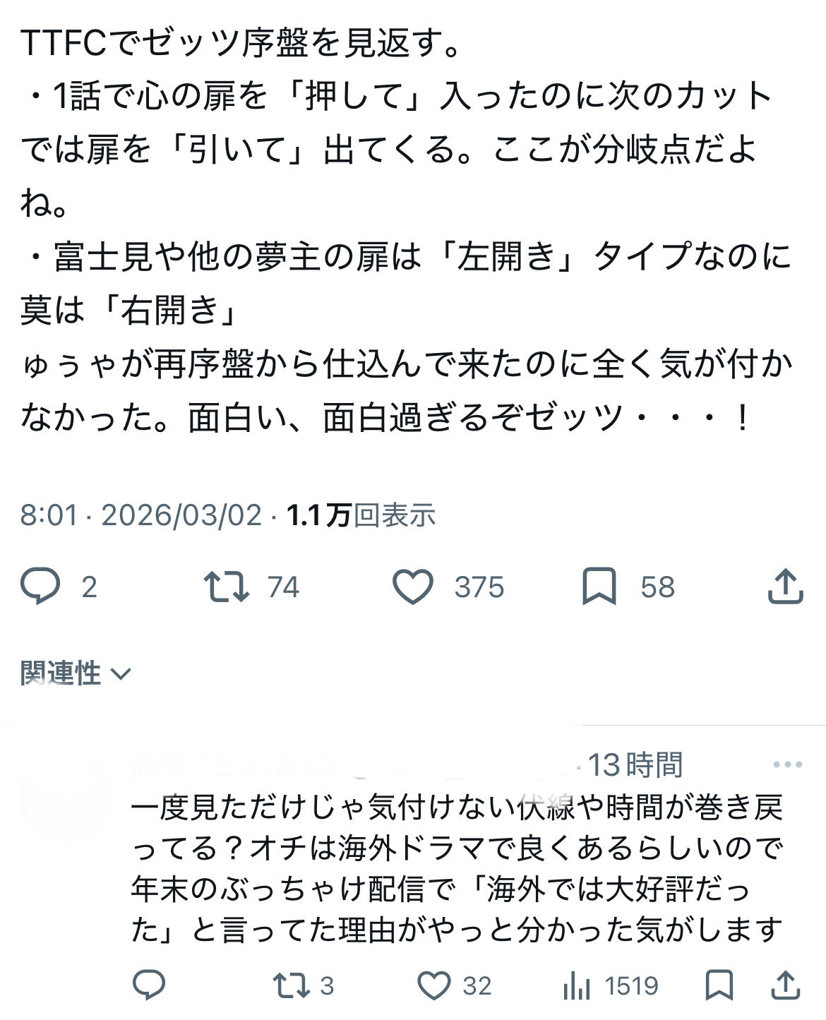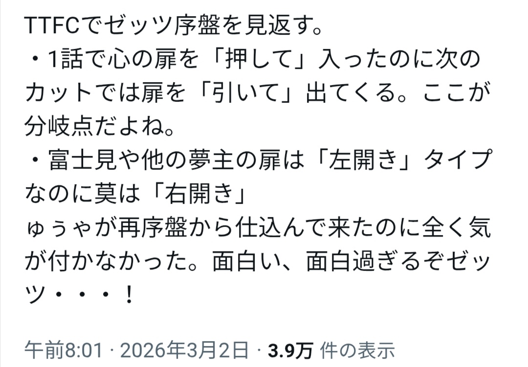 | … | 746無念Nameとしあき26/03/02(月)22:03:01No.1391197239そうだねx4扉の向きが逆であることが作話上何かに活かされるんですか? |