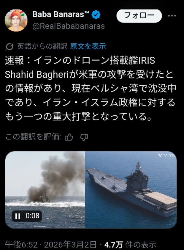 | … | 833無念Nameとしあき26/03/02(月)22:11:03No.1391199557+ 1772457063253.mp4-(1495798 B) >空母キラー(笑) |