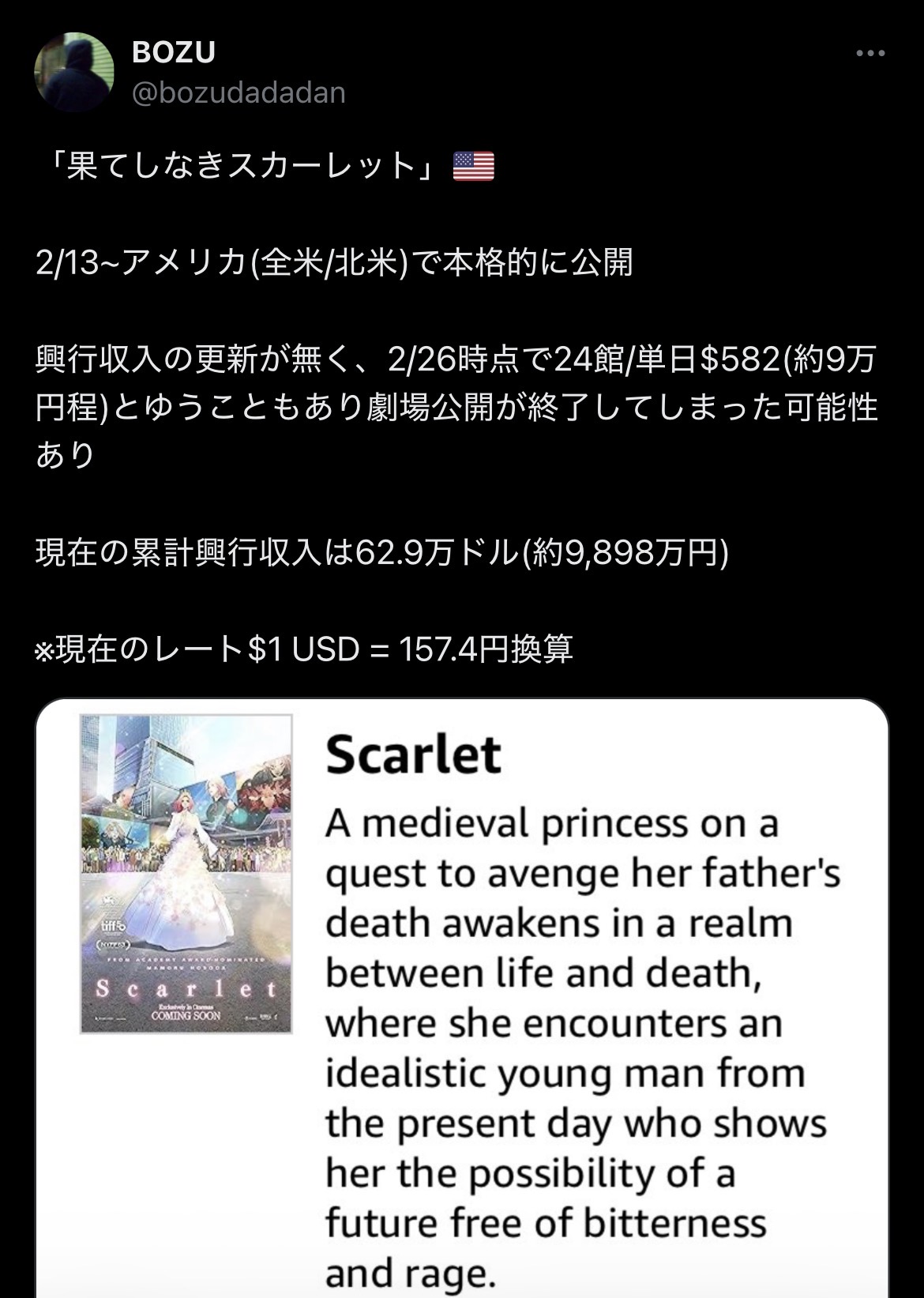 | … | 7無念Nameとしあき26/03/03(火)17:13:01No.1391345136+>全米も1億円届かず果てた |