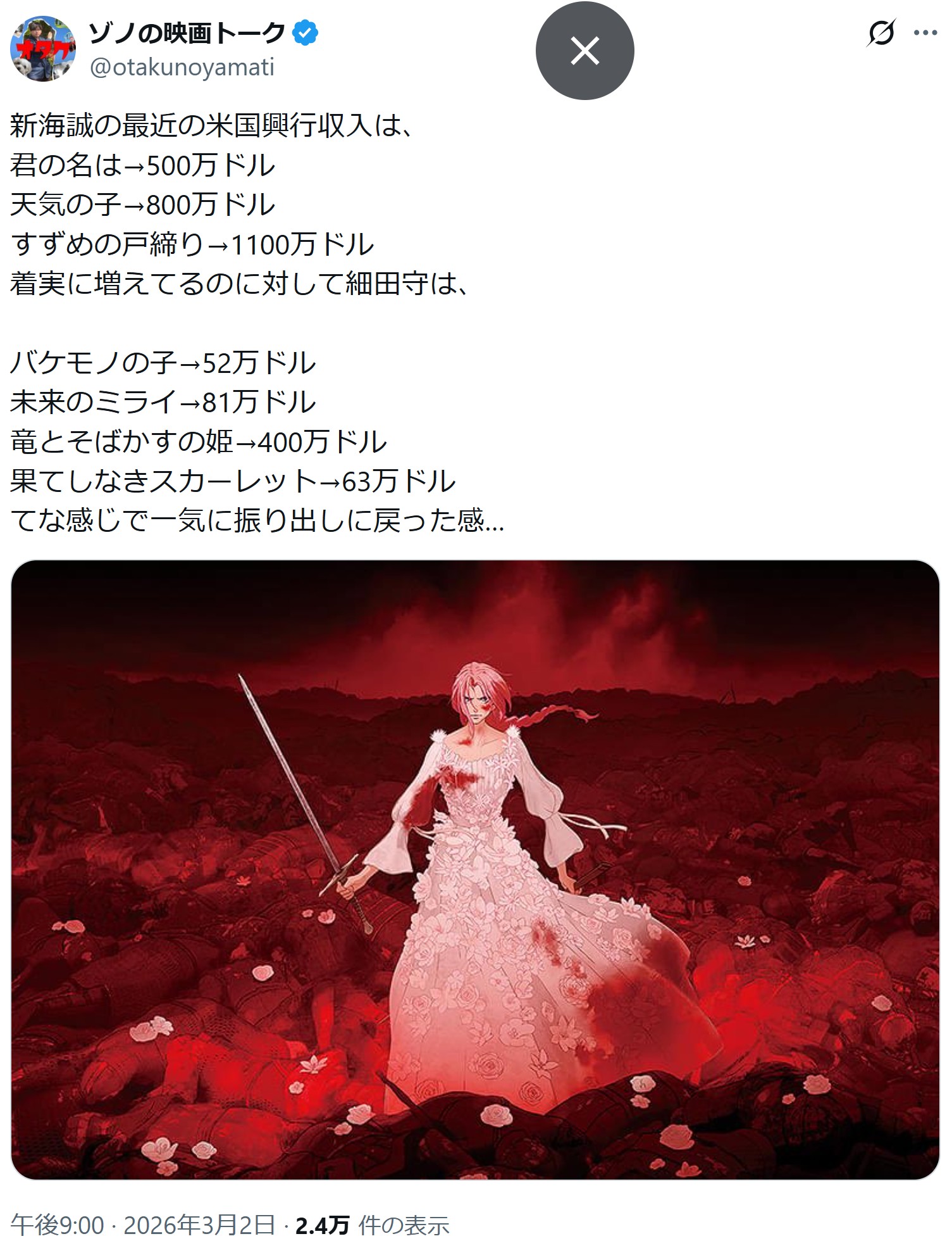 | … | 1無念Nameとしあき26/03/03(火)17:05:05No.1391343765そうだねx3 1772525105926.jpg-(285187 B) 全米も1億円届かず果てた |
