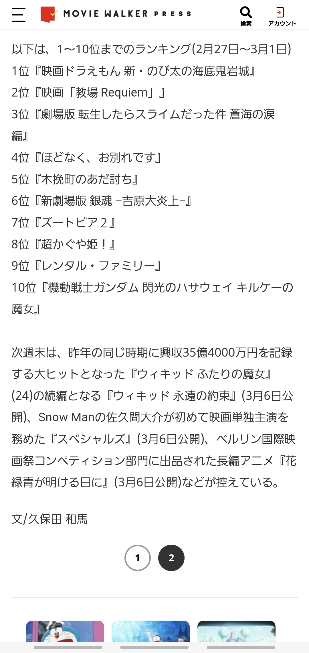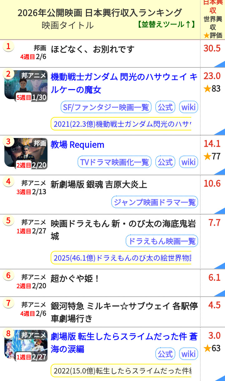 | … | 126無念Nameとしあき26/03/03(火)19:47:54No.1391379735そうだねx1>3月1日現在の興行収入 |