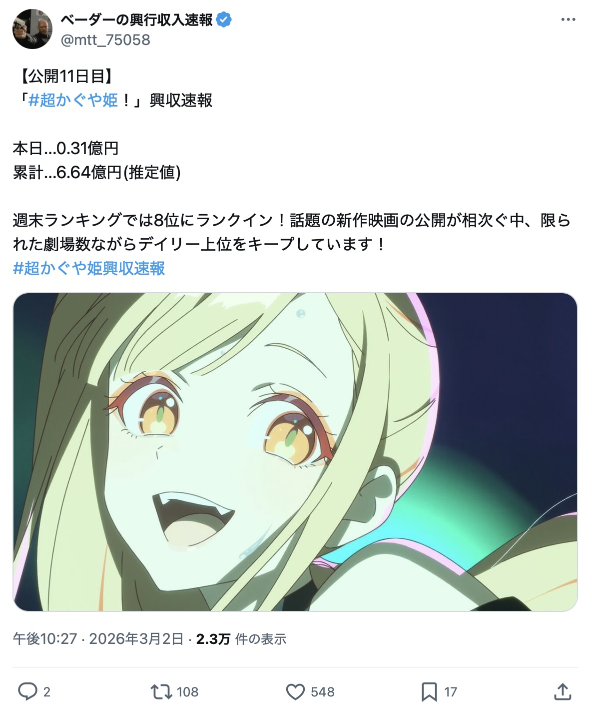 | … | 138無念Nameとしあき26/03/03(火)20:03:19No.1391383998+>>全く真逆の公開規模のかぐや姫に負けるのだけはやべーが |