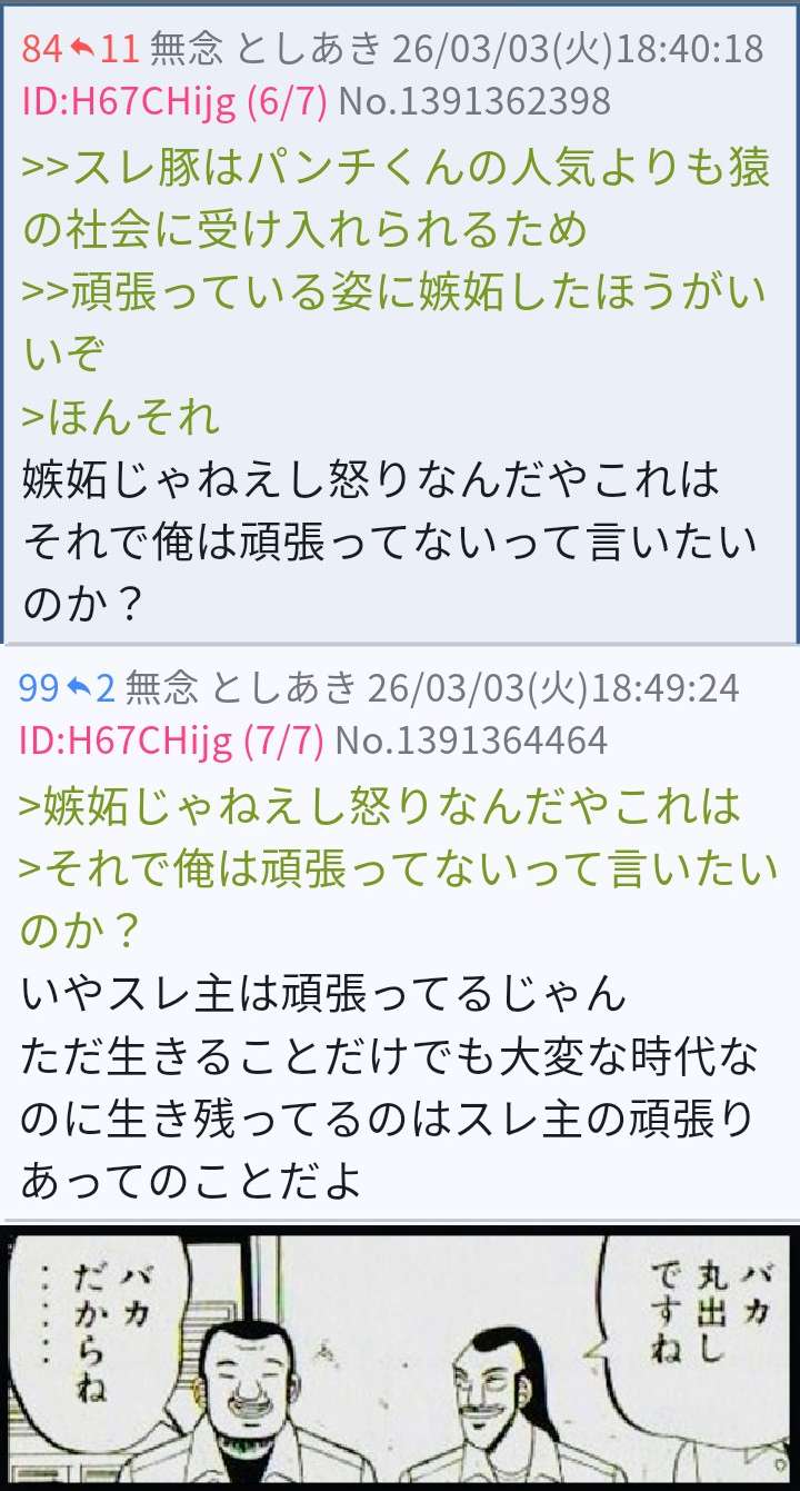 | … | 99無念Nameとしあき26/03/03(火)18:49:24 ID:H67CHijgNo.1391364464+>嫉妬じゃねえし怒りなんだやこれは |