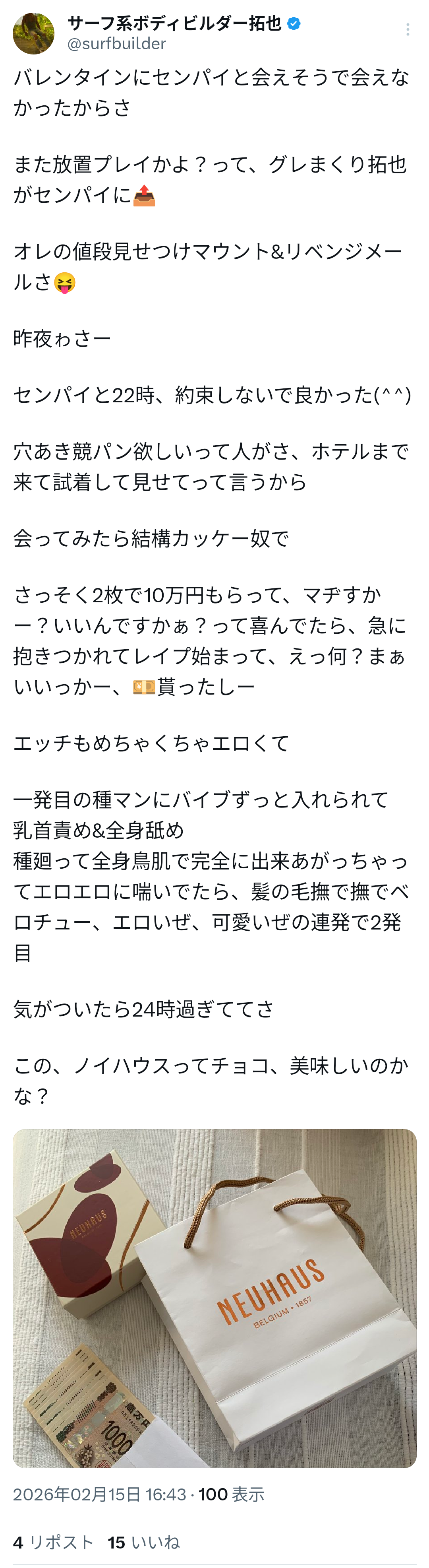 | … | 81無念Nameとしあき26/03/03(火)19:36:58No.1391376647+ムチろうそくフィスト窒息筋トレ拷問各種苦痛を伴うものが5000円で競パン+ウリが10万円はどう考えてもおかしいだろ… |