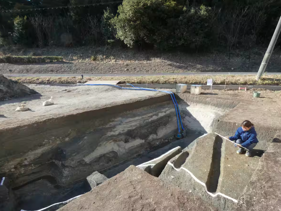 ▶古墳を訪ねると、地表から2メートルほど掘り下げられた発掘現場は、水をくみ上げるポンプが作動していた。「地下水が湧き出し、ポンプがなければすぐたまってしまう。水との闘いです」と市文化財課の村上朋(とも)さん。一帯は低湿地で古代から川が氾濫し、発掘では洪水跡も見つかった。