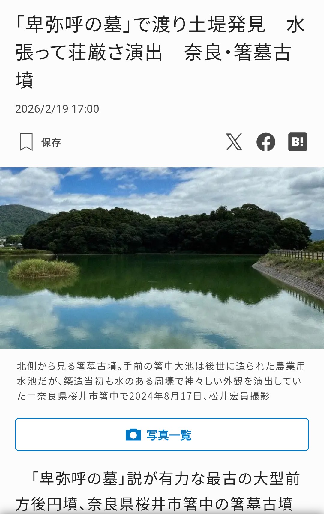 邪馬台国(やまたいこく)の女王・卑弥呼(ひみこ)の墓ともいわれる奈良県桜井市の箸墓(はしはか)古墳(3世紀後半)で先月、墳丘を囲む周濠(しゅうごう)から「渡り土堤(どて)」(長さ6・4メートル以上)が出土した。濠内の水をせき止める役割があったという。
