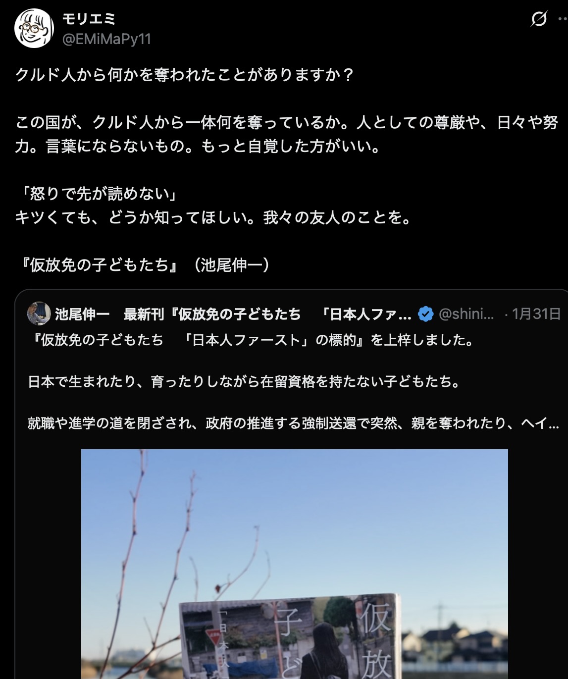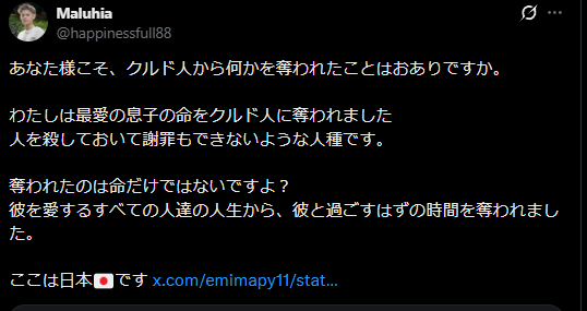 | … | 75無念Nameとしあき26/03/05(木)01:11:48No.1391666725そうだねx1>息子をクルド人に殺された人がポストを見てブチぎれ |