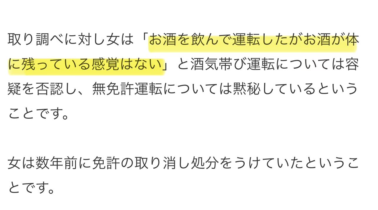 | … | 65無念Nameとしあき26/03/05(木)03:14:54No.1391675434+>「お酒を飲んで運転したがお酒が体に残っている感覚はない」 |