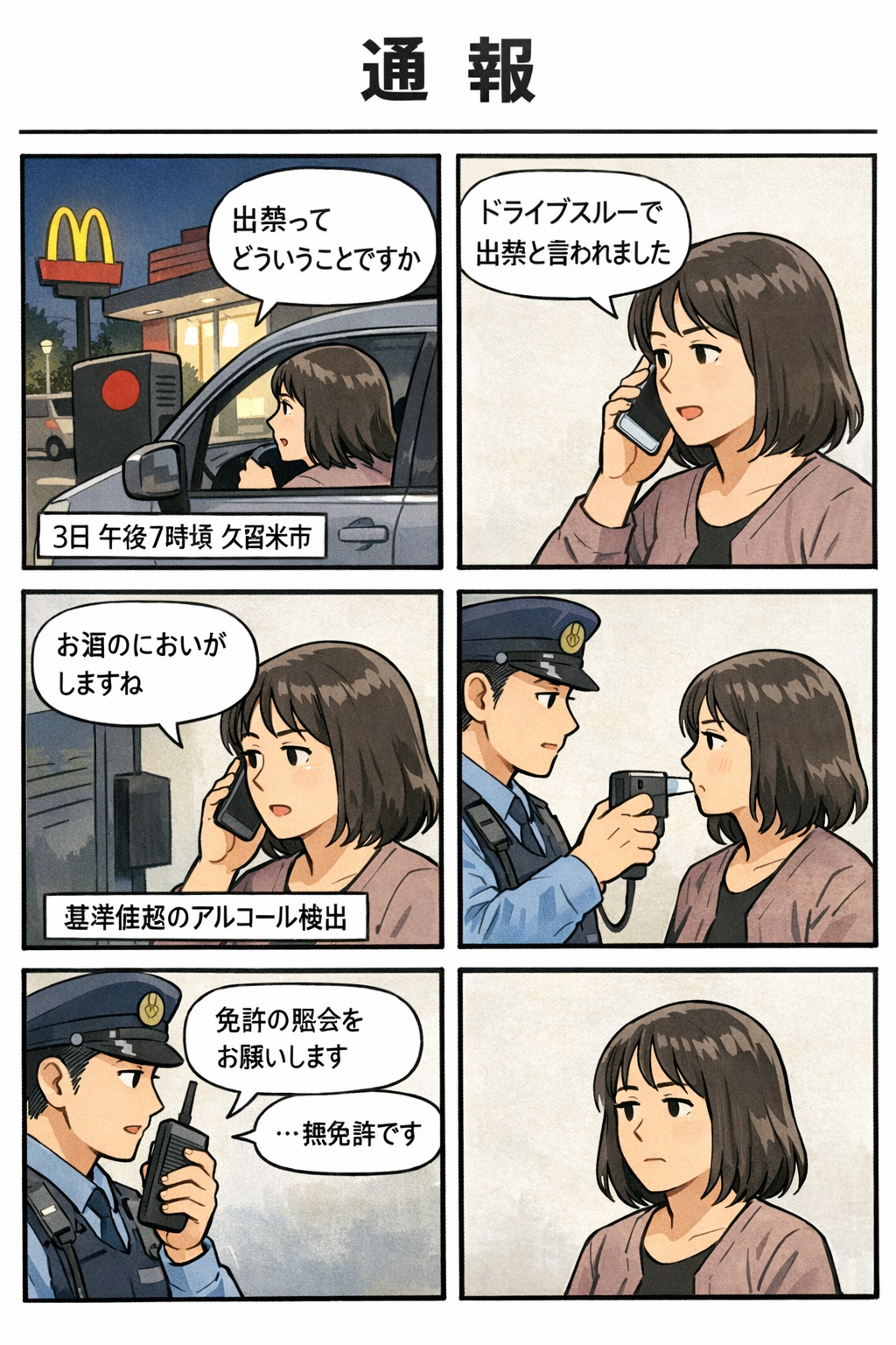 マクドナルドのドライブスルーで出禁と言われたのが不満で警察に通報したおばさん、無免許の上飲酒運転だったので自分が呼んだ警察に逮捕される