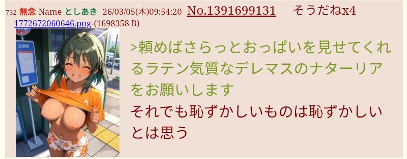 | … | 43無念Nameとしあき26/03/05(木)11:13:14No.1391709516+>よく考えなくてもここではトップレスとか普通のことであった |