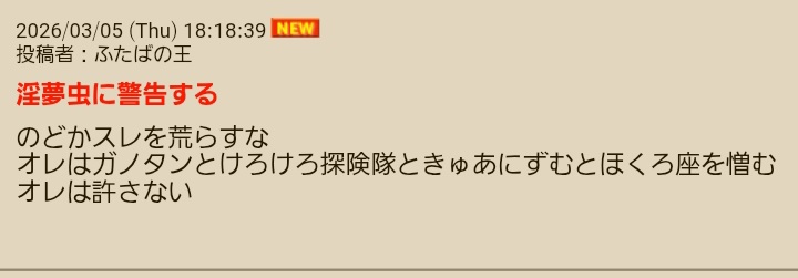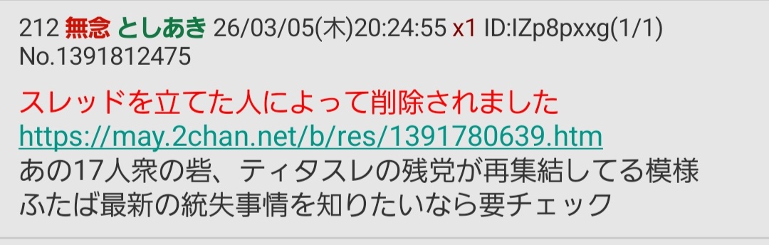 | … | 171無念Nameとしあき26/03/05(木)20:25:23No.1391812612そうだねx3 1772709923517.webp-(301786 B) >ティタスレは荒らしの総本山 |