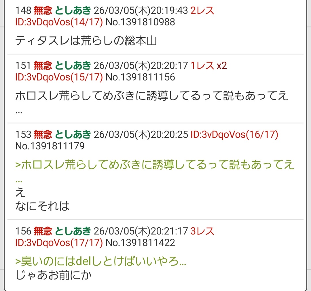 | … | 153無念Nameとしあき26/03/05(木)20:20:25 ID:3vDqoVosNo.1391811179+>ホロスレ荒らしてめぶきに誘導してるって説もあってえ… |