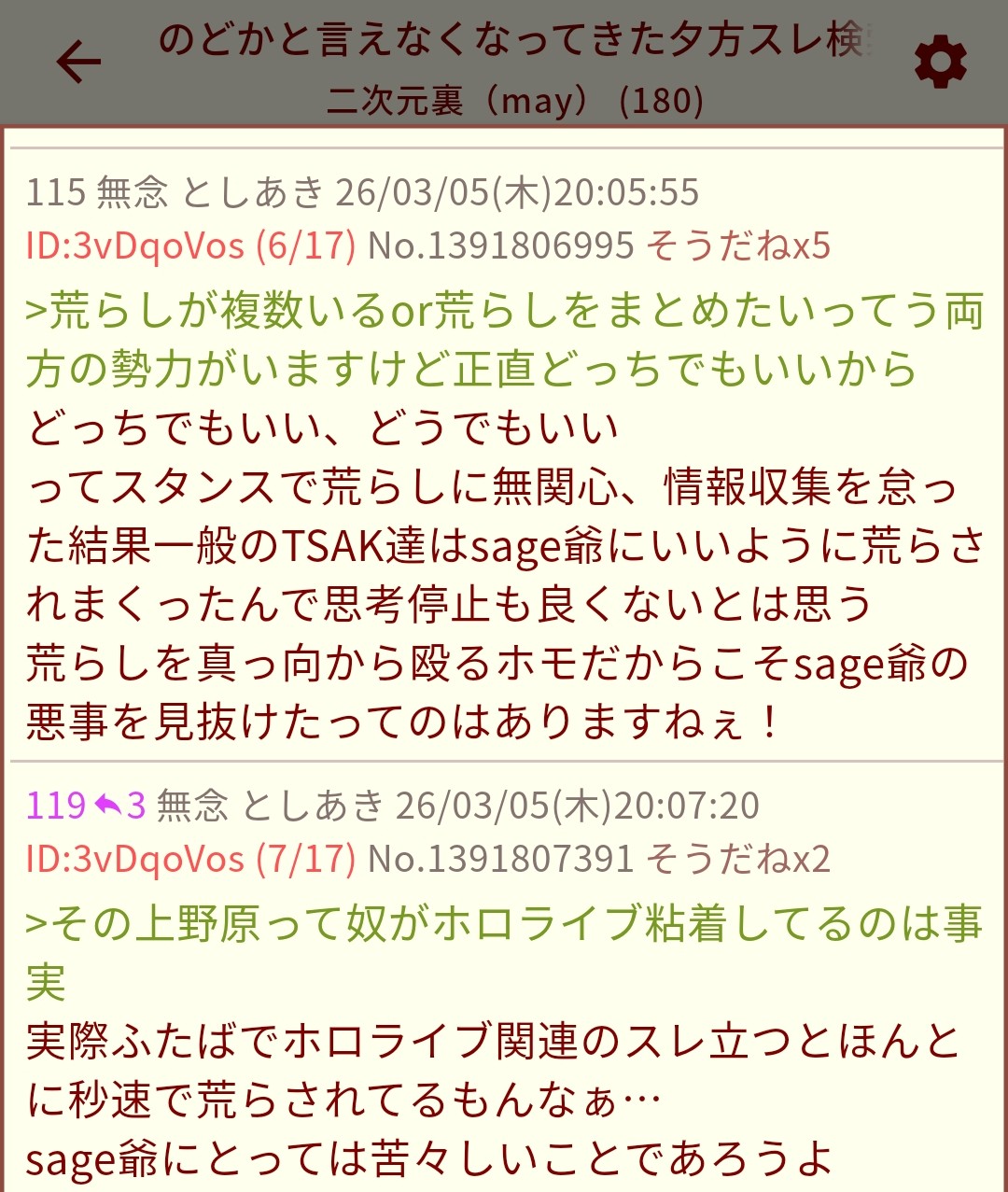 | … | 183無念Nameとしあき26/03/05(木)20:28:51No.1391813631そうだねx5>>そいつがVスレやらホロライブに粘着してる上野原か |