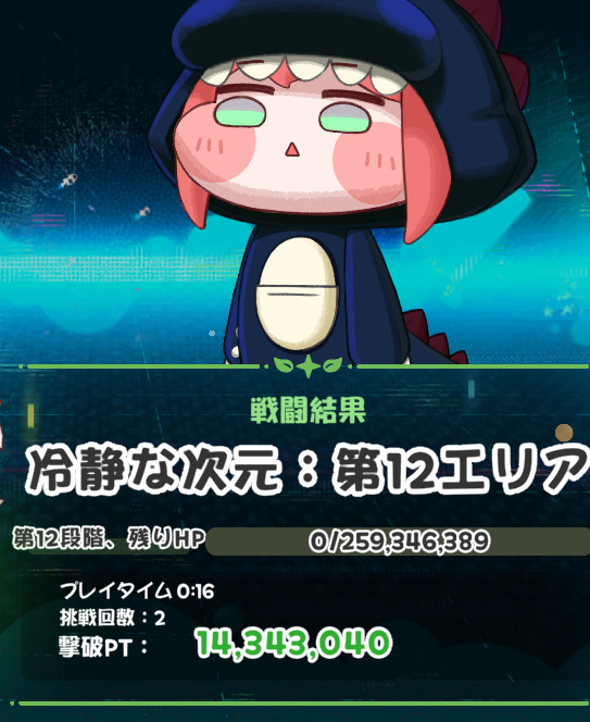 | … | 95無念Nameとしあき26/03/05(木)20:37:53 ID:AxUqcXmANo.1391816329+ 1772710673178.png-(1739220 B) 14段階2パーティで削り切ったにゃん今回の次元は終了にゃん |