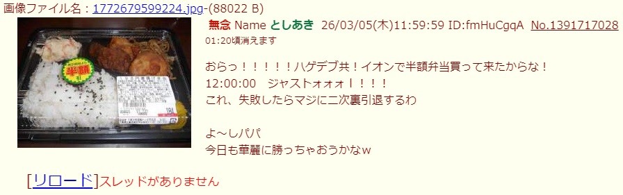 | … | 50無念Nameとしあき26/03/05(木)19:26:06No.1391795858+半額弁当に喜ぶ貧民のスレあき |