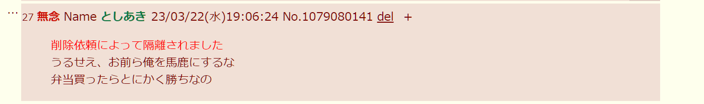 | … | 56無念Nameとしあき26/03/05(木)19:32:56No.1391797756そうだねx7>半額弁当に喜ぶ貧民のスレあき |