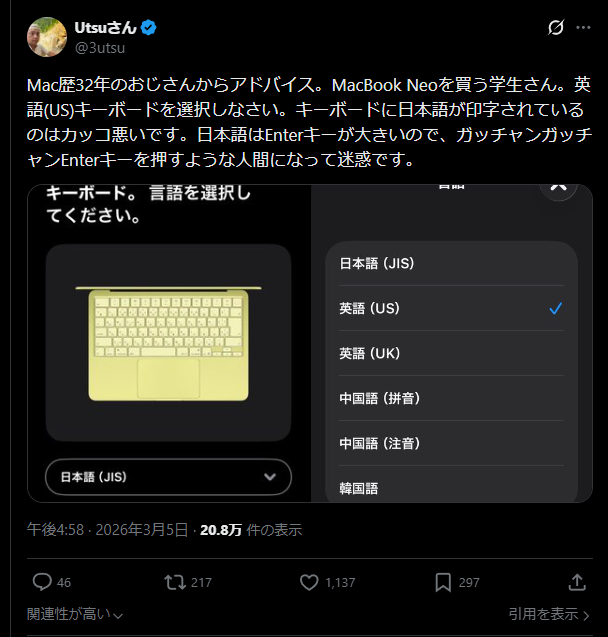 | … | 34無念Nameとしあき26/03/06(金)05:52:09No.1391892450+32年もマック使ってて言えることがUSキーボードにしろなのか |