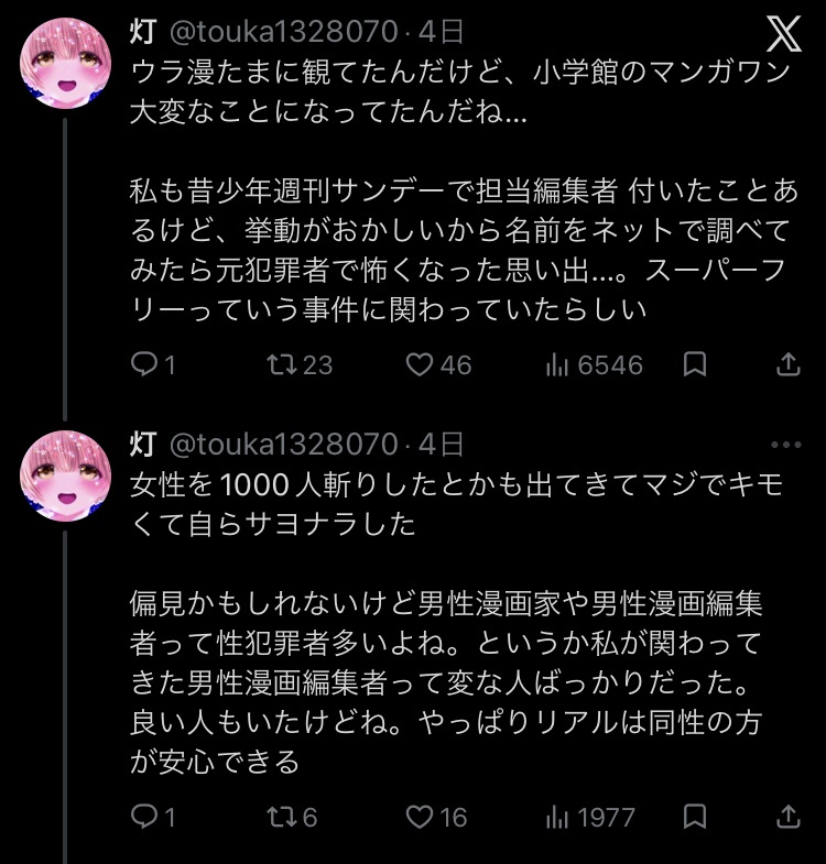 | … | 43無念Nameとしあき26/03/06(金)07:32:42No.1391897487そうだねx1いざとなれば尻切できる体制だとしても作家ごと捨てるのが小学館のやり方なのだな |