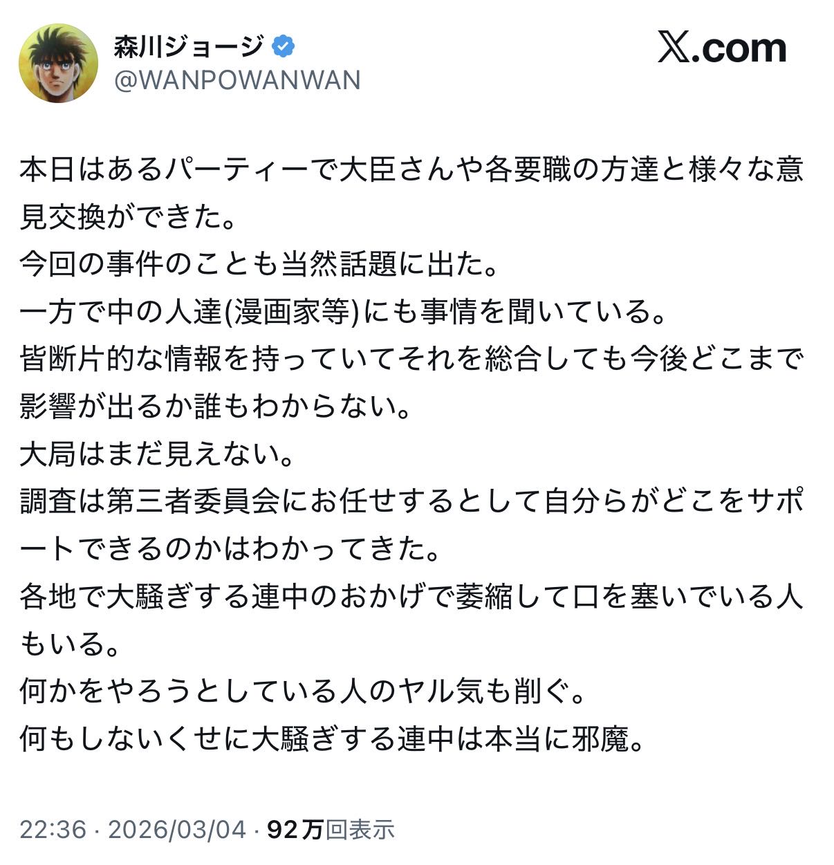 | … | 244無念Nameとしあき26/03/06(金)08:39:08No.1391903557そうだねx1漫画家協会は一匹狼の集まりだから漫画界を代表しての意見とかないしXの書き込みは個人の意見で協会は関係ない |