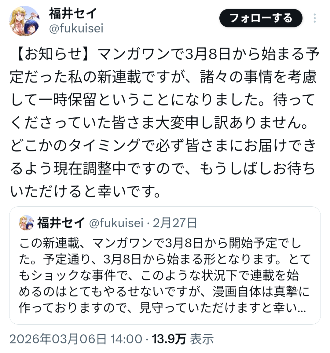 | … | 7無念Nameとしあき26/03/07(土)00:40:03No.1392093789+>声明出してても小学館に都合を最優先にしてる偽物も出て来たから気をつけよう |