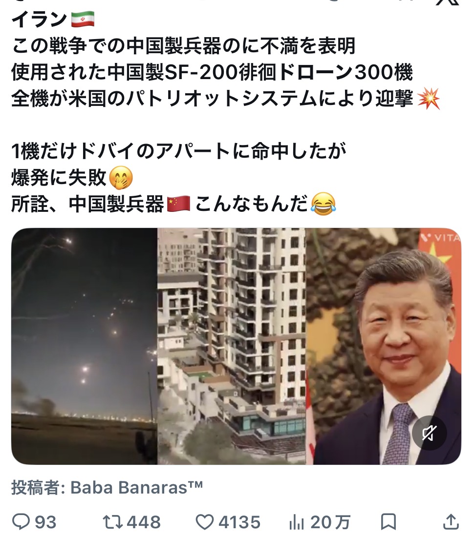 | … | 6無念Nameとしあき26/03/07(土)06:10:02No.1392115037そうだねx37中華製の防空システムが2回連続で機能してないってバレちゃったもんな |