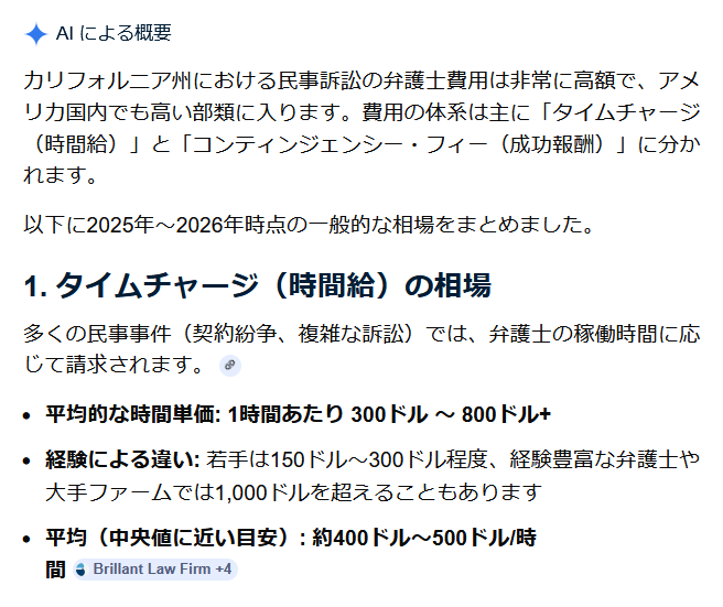 | … | 145無念Nameとしあき26/03/08(日)16:08:30No.1392479786+ 1772953710503.png-(54475 B) カリフォルニア州だと最低クラスの弁護士を雇っても時給5万ぐらいか……時給5万!? |