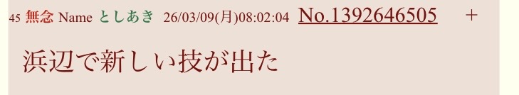 | … | 46無念Nameとしあき26/03/09(月)11:45:12No.1392672286そうだねx2>>>おはよー |