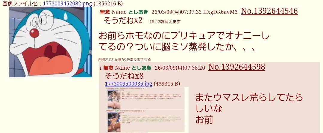 | … | 25無念Nameとしあき26/03/09(月)08:34:03No.1392649519そうだねx6ドラえもんスレまで含めたらこいつ一人でどんだけクソスレ立ててんだよ |