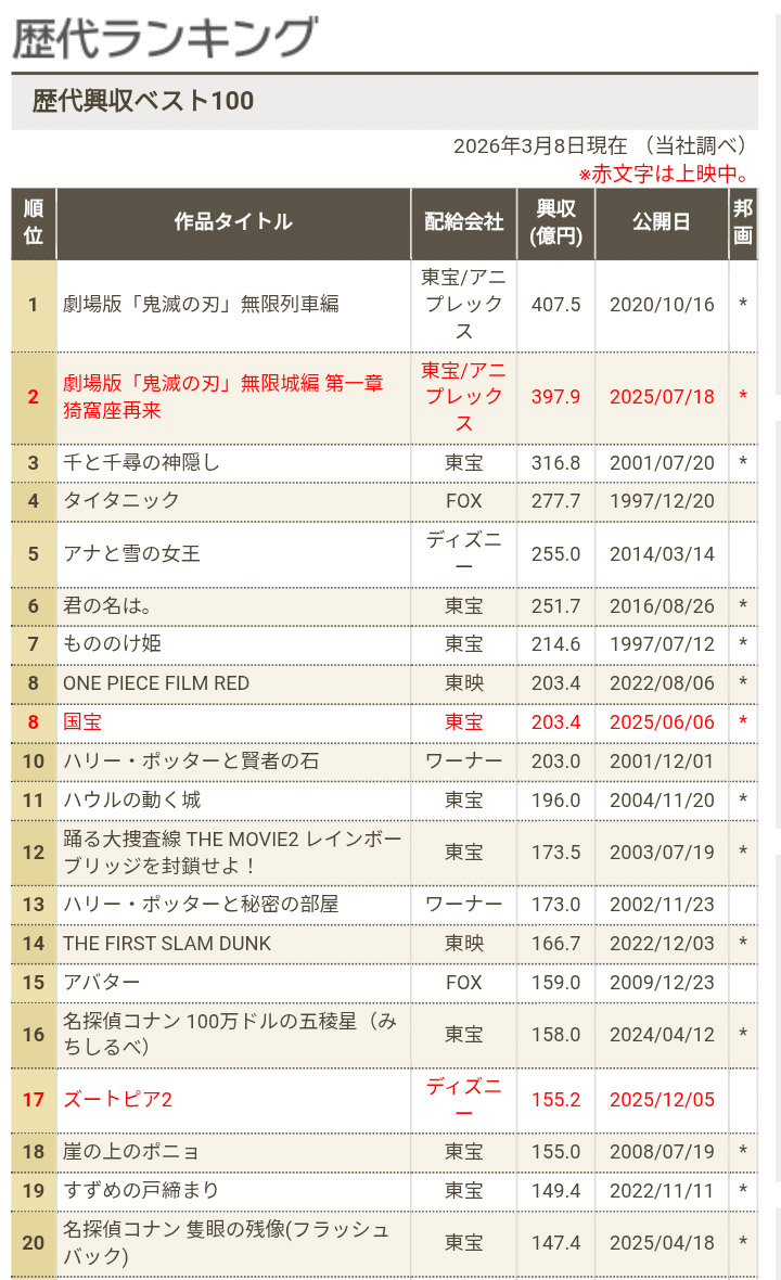 | … | 4無念Nameとしあき26/03/09(月)17:09:11No.1392721817+鬼滅があと2つうえに来る予定だけどそれでも国宝はトップ10に残りそうか |