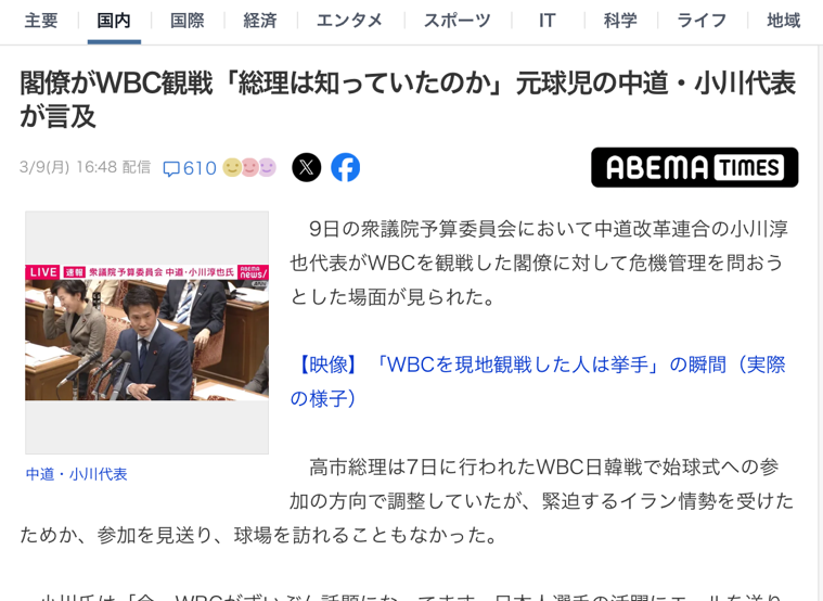 | … | 35無念Nameとしあき26/03/09(月)20:46:10No.1392769905そうだねx1高市閣僚WBC観戦追及チームまだかよ |