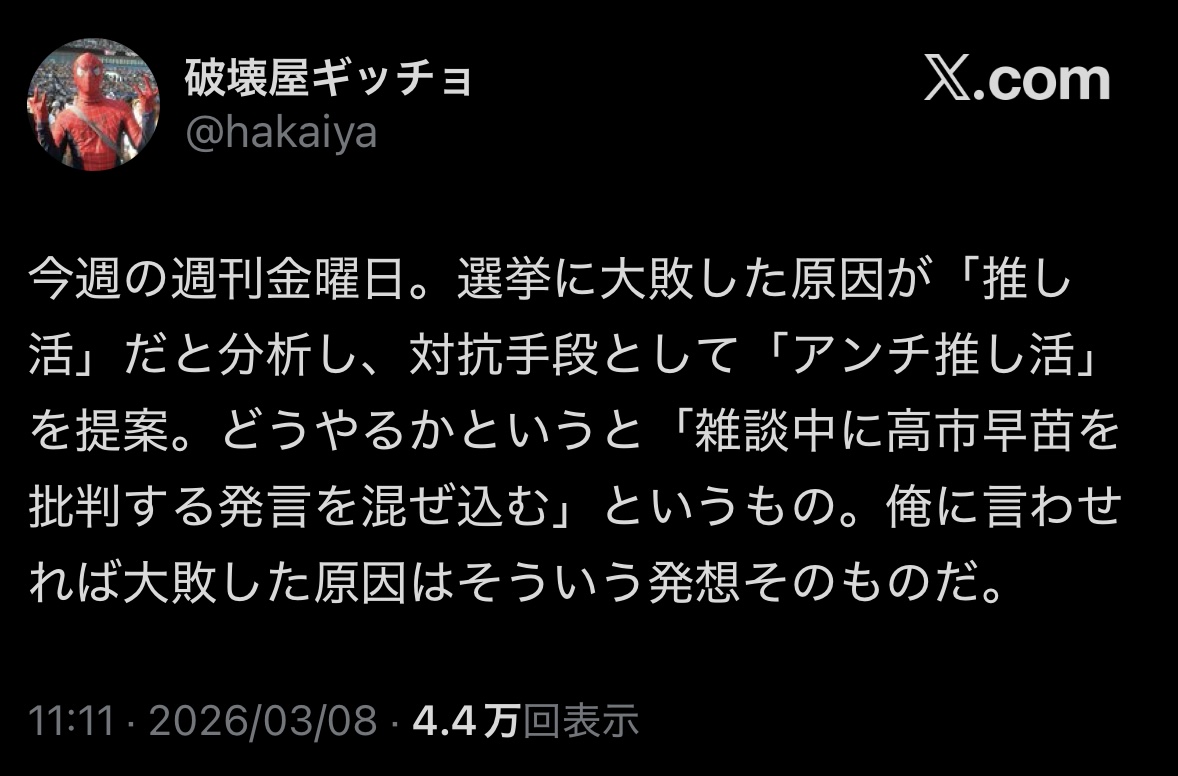 | … | 53無念Nameとしあき26/03/10(火)10:44:40No.1392871676そうだねx1>なんでこんな畑違いの奴に政治語らせてんの?バカなの? |