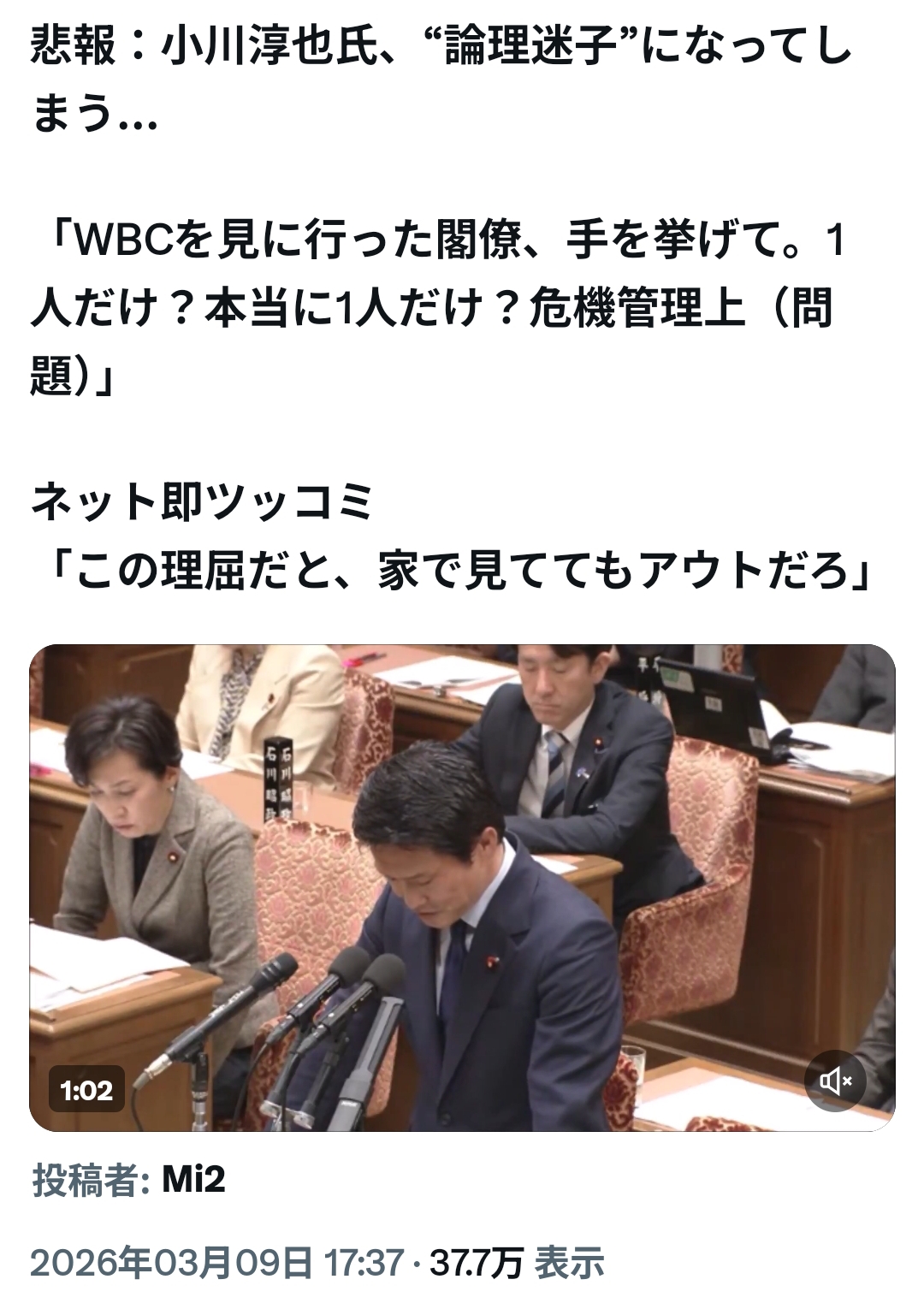 | … | 192無念Nameとしあき26/03/10(火)11:44:01No.1392879945そうだねx2>小川マジですごいな期待以上に少数野党ムーブしかやらない |