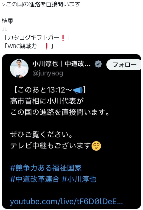 | … | 201無念Nameとしあき26/03/10(火)11:45:33No.1392880171+>大敗してなんにもできないからとにかく批判しまくる小川を代表にしたんだな |