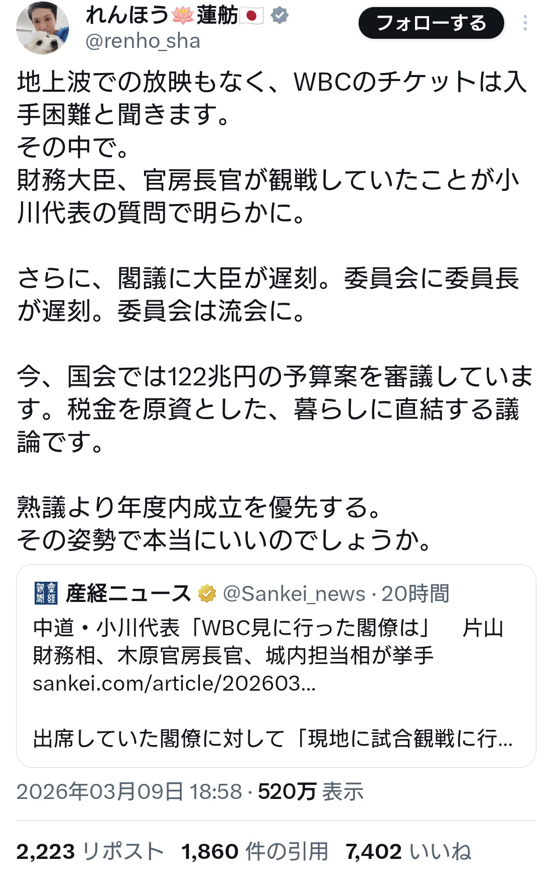 | … | 84無念Nameとしあき26/03/10(火)10:54:08No.1392872926そうだねx4WBC観戦罪が通るのって国会の仕事サボって言ってる場合だけだよな |