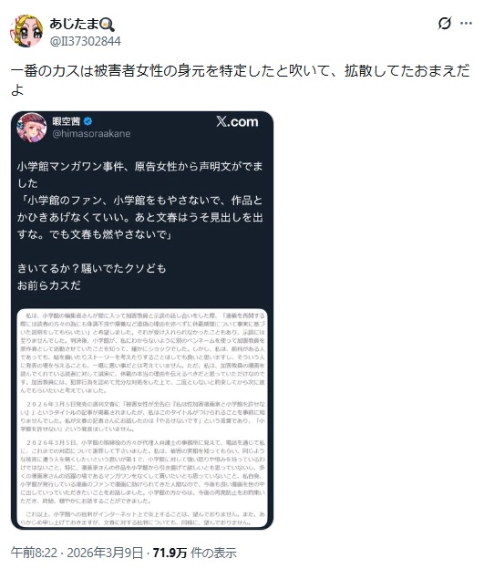 | … | 91無念Nameとしあき26/03/10(火)15:00:26No.1392913078そうだねx3被害者の声明で小学館叩いてたやつかボコボコにされてるんだけど |