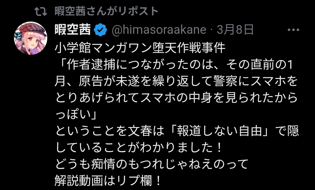 | … | 82無念Nameとしあき26/03/10(火)14:58:28No.1392912807そうだねx2NHKは逮捕→報道で小学館は逮捕→隠蔽の違いも理解できてないのがバカアノン |