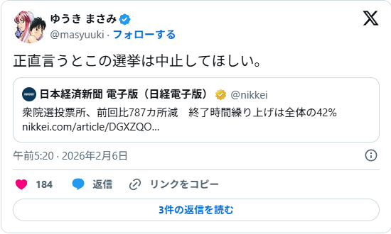 | … | 384無念Nameとしあき26/03/10(火)17:47:18No.1392939012そうだねx2>選挙を中止して欲しいって右左関係なくその…なんといいますか… |