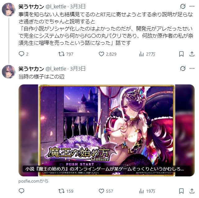 | … | 797無念Nameとしあき26/03/10(火)20:03:04No.1392970210そうだねx7 1773140584464.png-(415829 B) >魔王の始め方の企画時にFG〇のパクリを止めさせるんだよ |